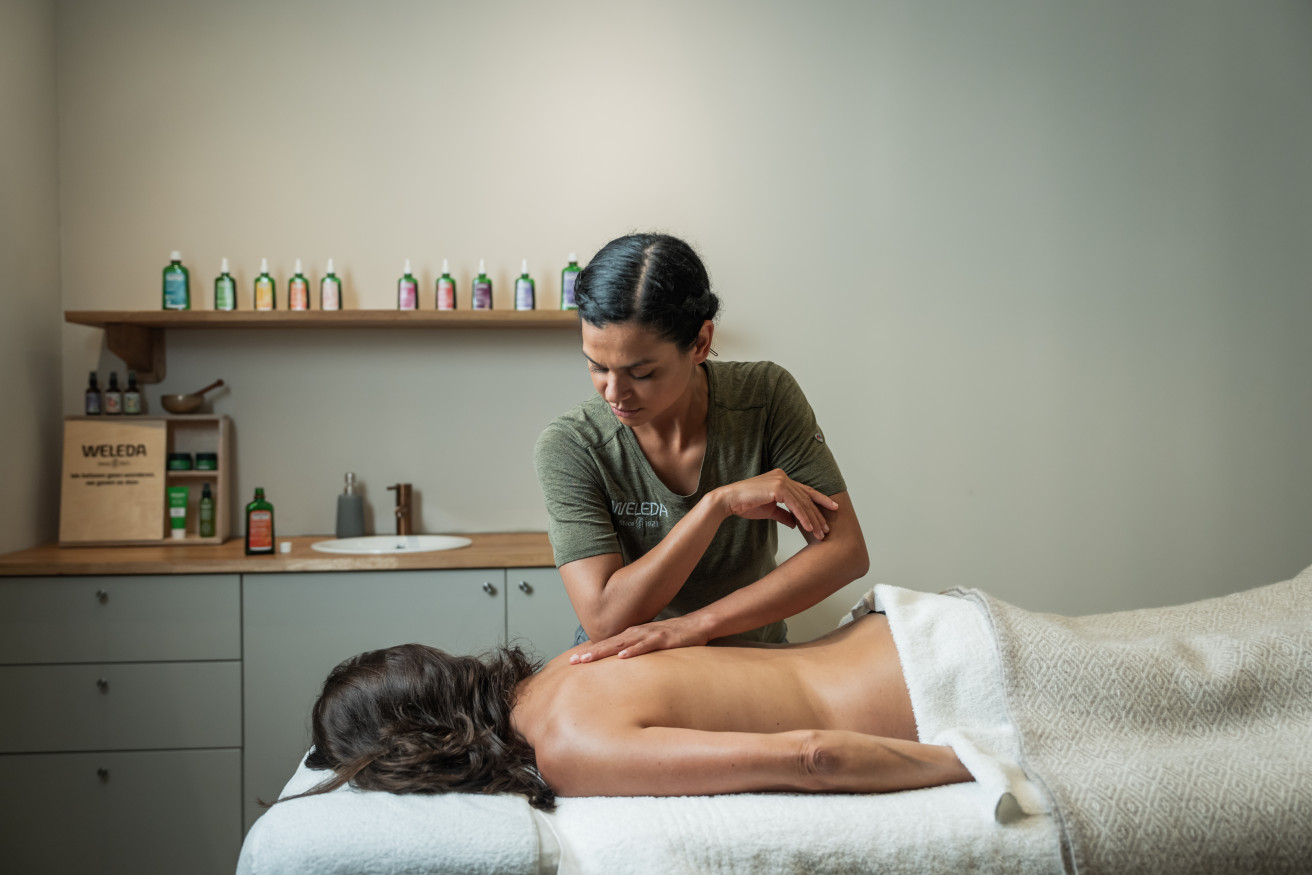 Wohltuende lösende Rücken/Schulter/Nackenmassage mit Weledas Arnika-Öl. Regt die Hautdurchblutung an.