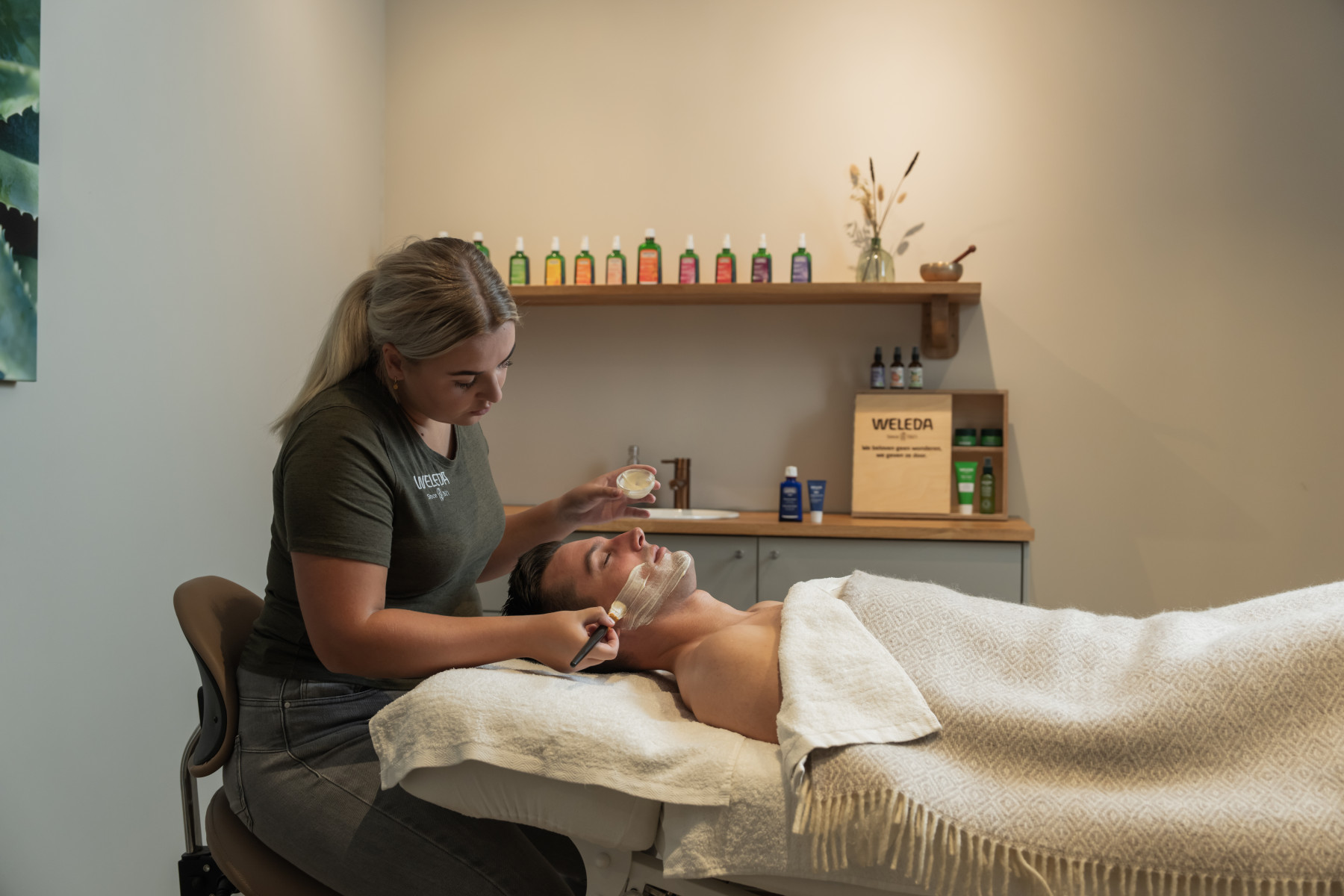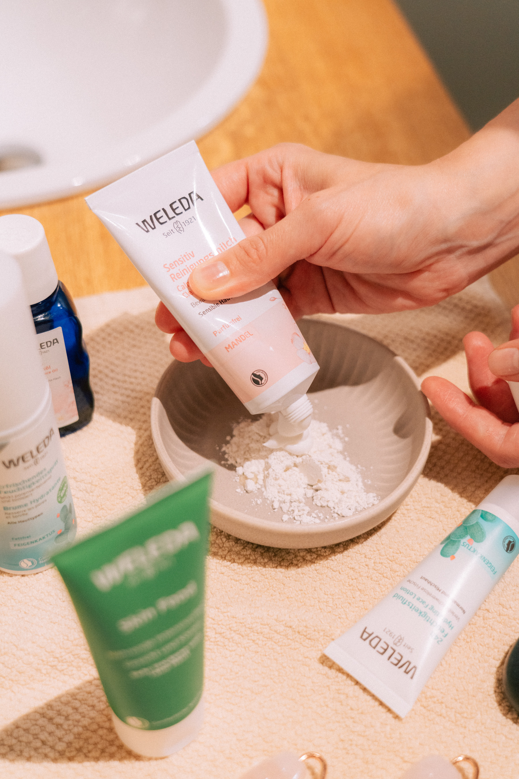 In erster Linie kommen Produkte der 100% zertifizierten Naturkosmetik von Weleda zum Einsatz.